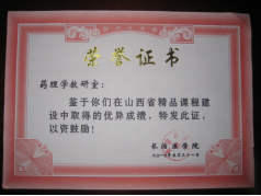 老教师传、帮、带,青年教师大胆创新,促使教学水平不断提高,荣获多种奖励。获山西省教学名师1人,长治医学院优秀教师4人次;全国医药院校实验教学改革大赛二等1项,山西省教学成果特等奖1项、一等奖1项,长治医学院教学成果特等奖1项、一等奖1项;山西省青年教师教学基本功大赛等奖2项,长治医学院青年教师教学基本功大赛二等奖2项、三等奖2项;指导学生获全国药学专业大学生实验技能竞赛二等奖、三等奖各1项,指导学生获山西省兴晋挑战杯”大学生课外学术科技作品竞赛三等奖1项。
